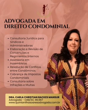 Direito Cível – incluindo Direito de Família (divórcio, reconhecimento e dissolução de união estável, guarda dos filhos, alimentos, regulamentação da convivência, execução de alimentos, adoção, destituição do poder familiar), de Sucessões (planejamento sucessório, inventário e testamento), Imobiliário, Trânsito (recursos administrativos e esfera judicial, criminal e cível), Condominial (consultoria, cobranças, síndica profissional, elaboração e revisão de convenções, assessoria em assembleias e resolução de conflitos), Responsabilidade Civil, Contratos, Obrigações e Dívidas, Direito do Consumidor e outros.